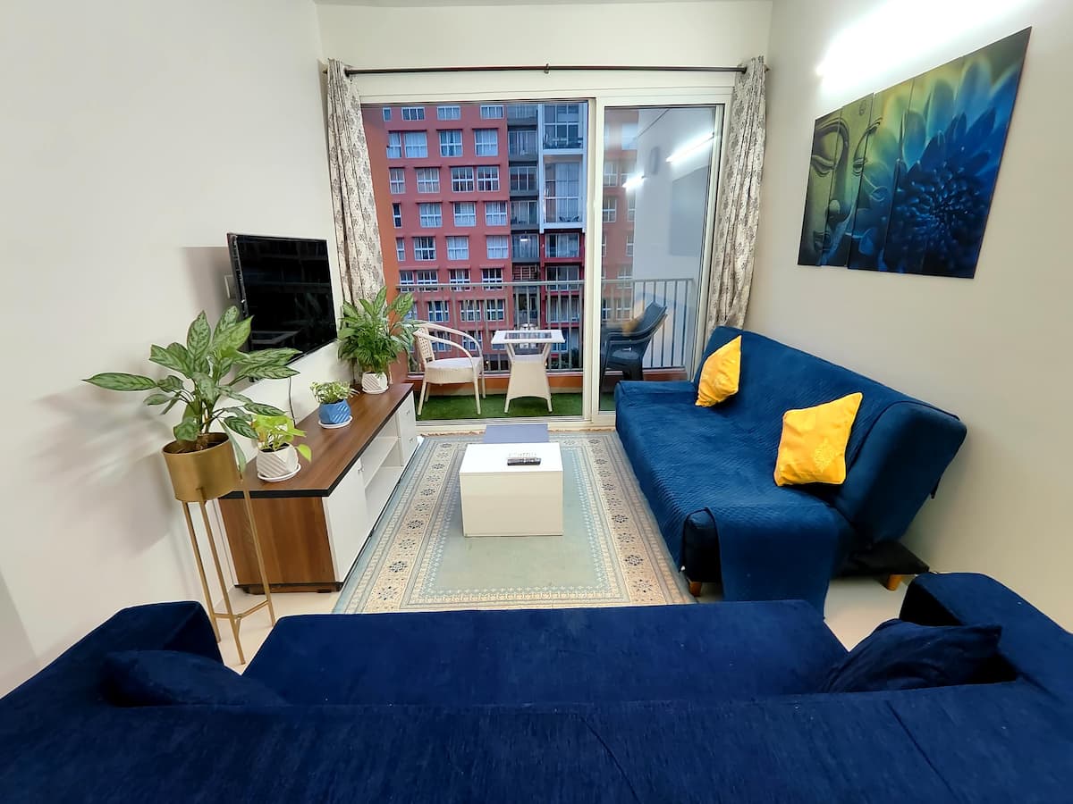 The living room offers elegance and comfort with stylish decor, ample ventilation, and air-conditioning to keep you cool. Stay connected with high-speed WiFi up to 100 Mbps 🖇, and enjoy entertainment on the smart TV 📺. For extra sleeping space, there’s a sofa cum bed 🛋. Step out onto the attached balcony for a serene experience 🌞.