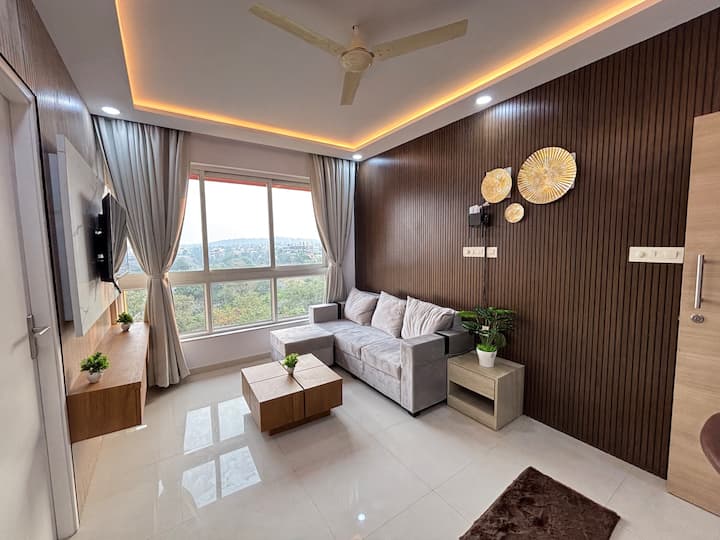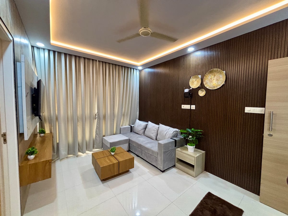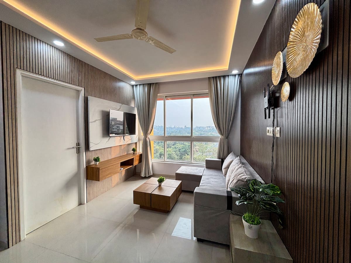 The living room offers stylish dΓ©cor with good ventilation and air conditioning, ensuring a comfortable atmosphere. π It is equipped with high-speed WiFi up to 100 Mbps for seamless connectivity. For your entertainment, a smart TV is available, πΊ. The room opens to an big window , providing a serene outdoor experience. π
